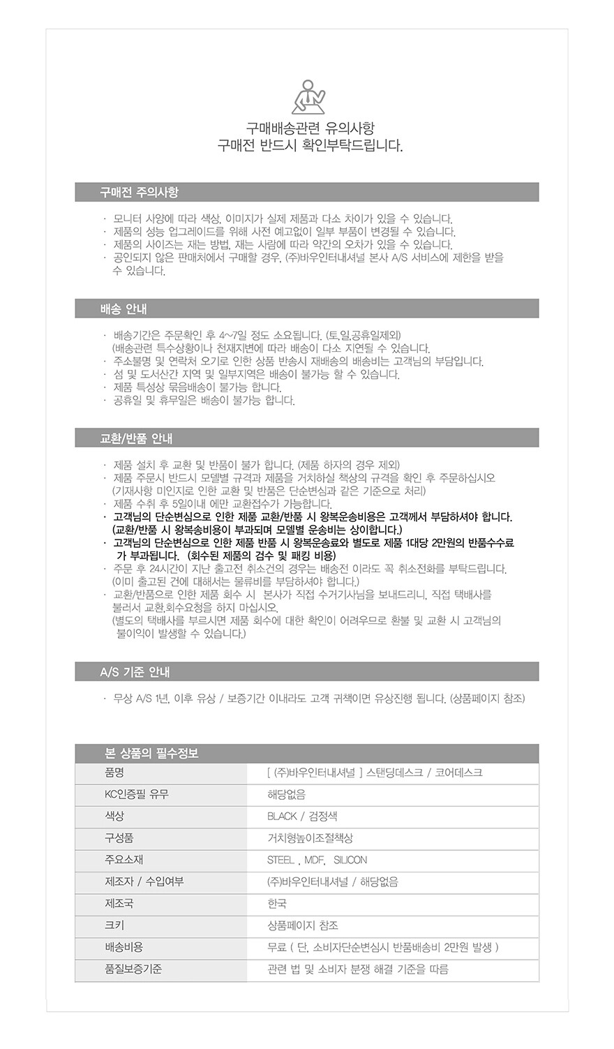 2. 제품에 하자가 없거나 도착된 제품이 고객님께서 주문하신 제품과 동일할 경우의 사이즈 교환, 색상 교환, 고객님의 변심에 의한 단순 구매 의사 변화, 기타 고객님의 과실에 의한 반품, 교환시의 왕복 택배비 및 제반비용은 고객님 부담입니다.
