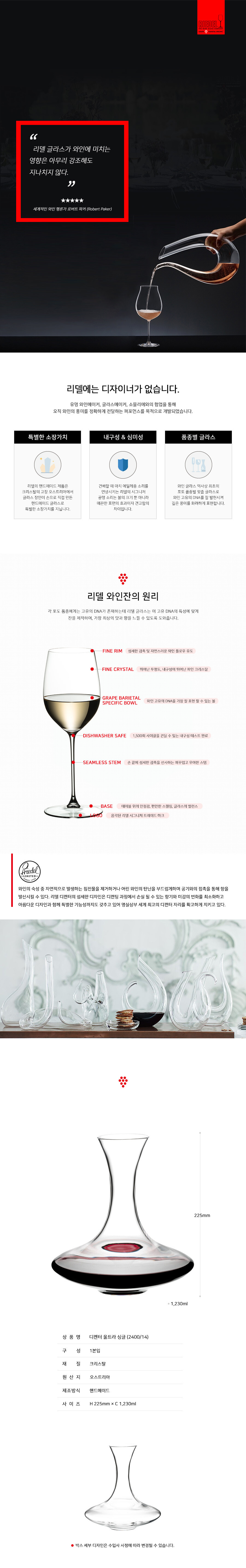 아울러 지금 보고 계신 울트라 싱글은 긴 목과 커다란 바디로 와인이 공기에 최대한 노출되도록 디자인 되었으며, 그 모양새는 현대 크라스탈의 디자인을 반영하고 있습니다. 또한 울트라 싱글은 입으로 불어 수작업으로 만들어지며 산화연 24% 이상의 최고급 크리스탈 디켄터입니다.