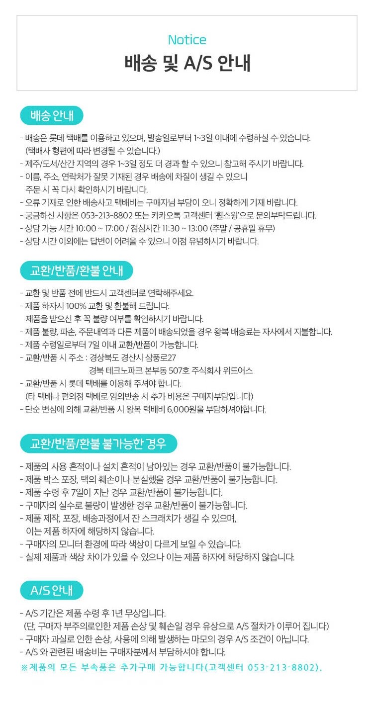 A/S 관련 문의 : (주)위드어스 고객센터 053-213-8802 문의 가능 시간 평일 오전 10시~오후 6시 주말.공휴일 휴무