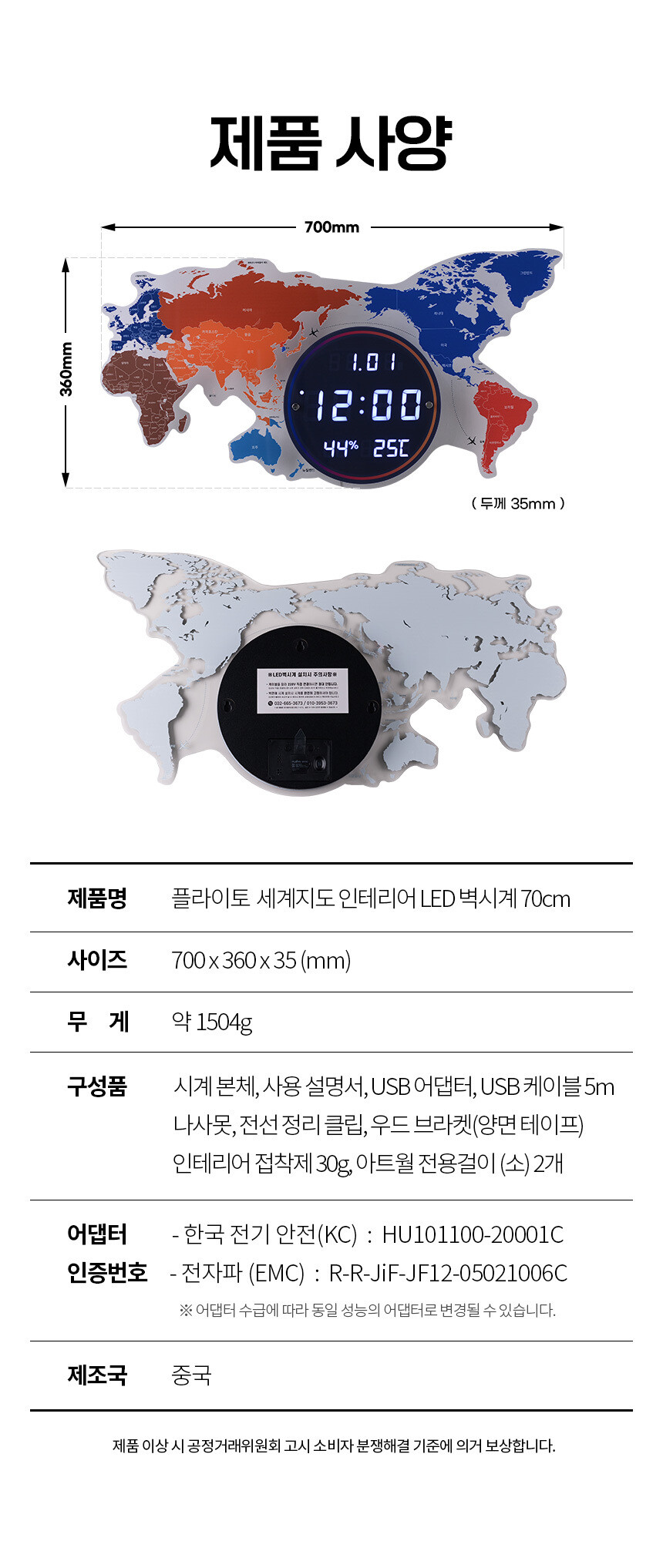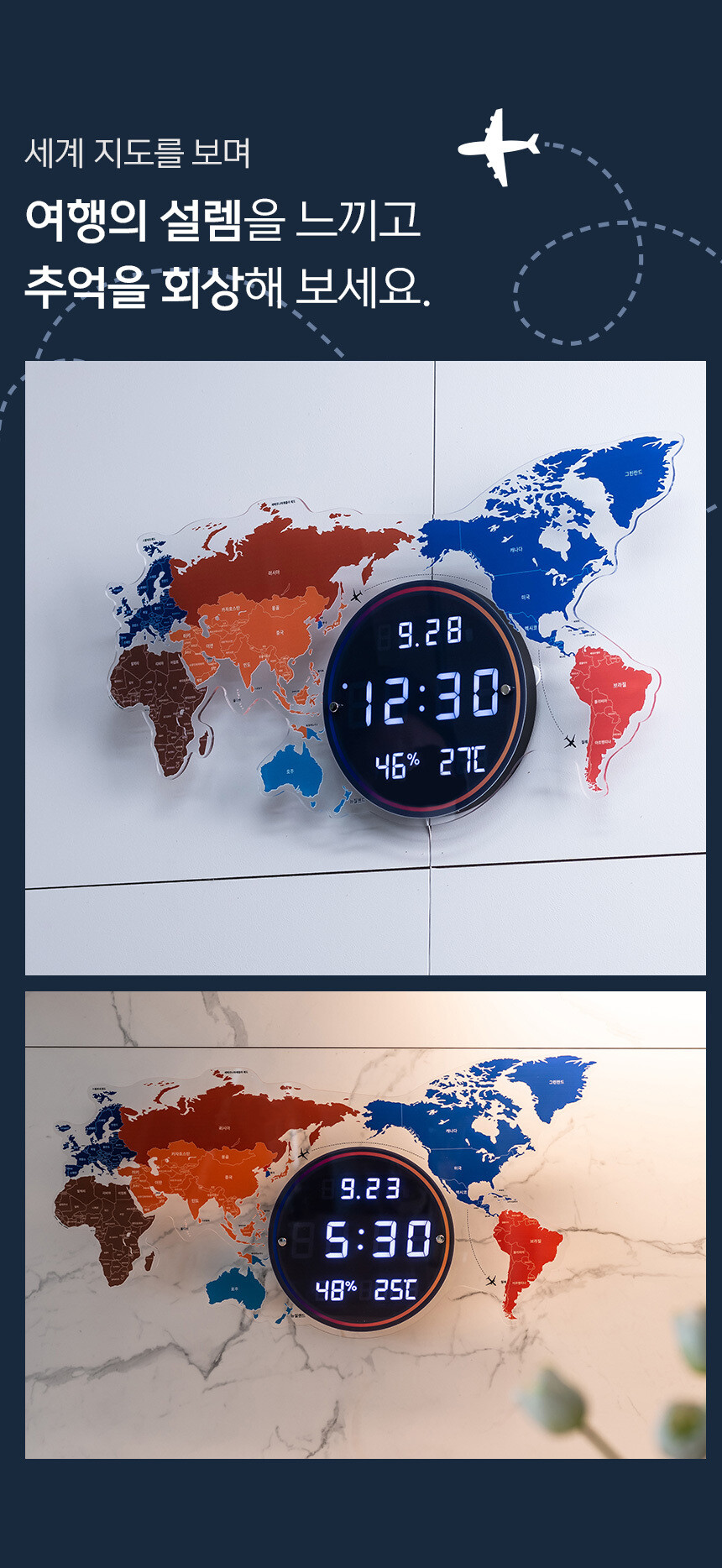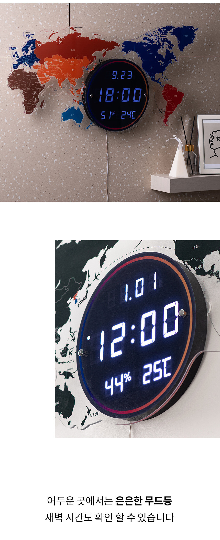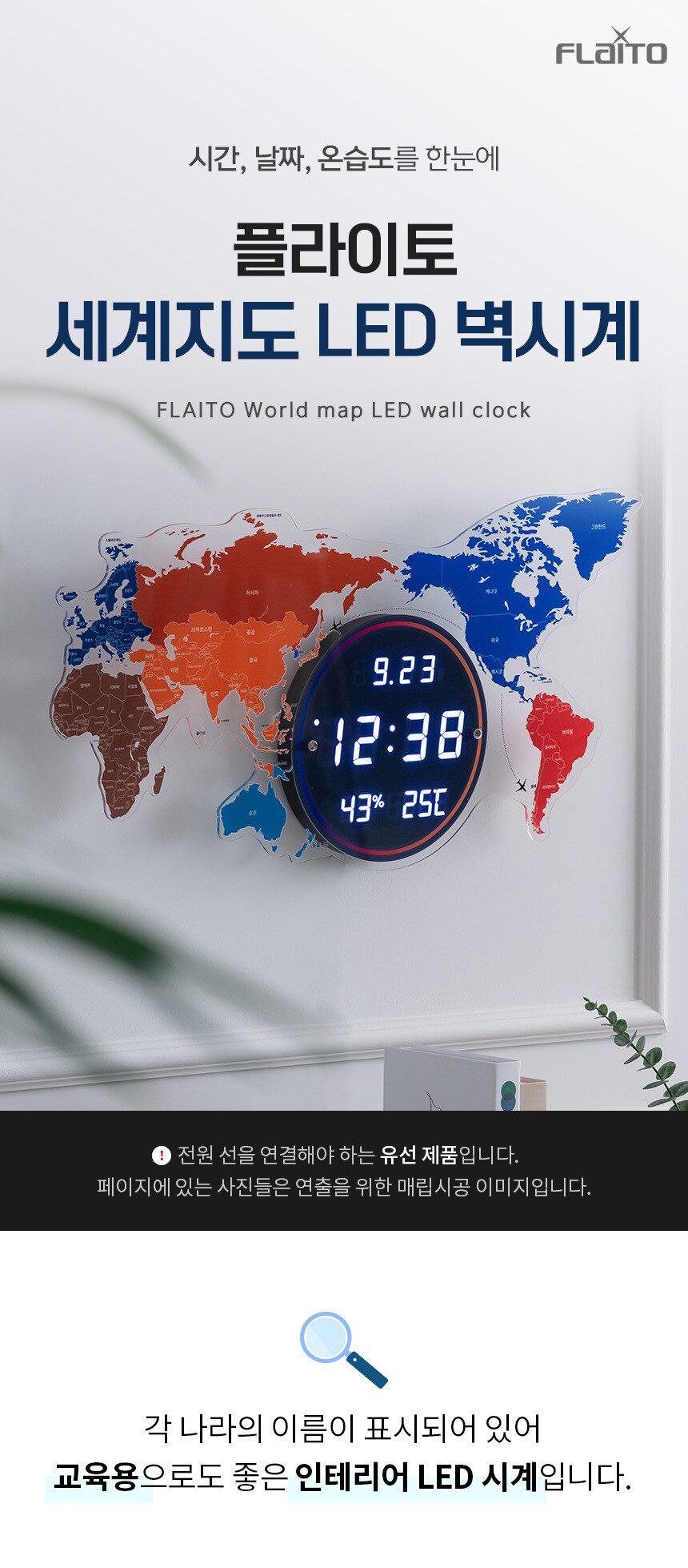 플라이토 세계지도 LED 인테리어 벽시계 70cm